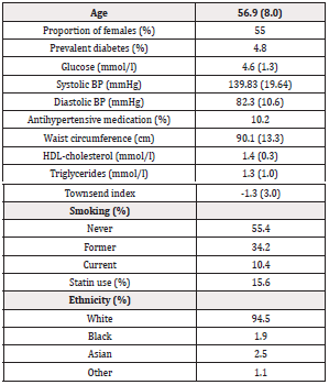 Table 1: Basic characteristics in the sample with complete data on metabolic syndrome components and after exclusion of individuals with prevalent cardiovascular diseases at the baseline investigation (n=388,801). Means and SD are given or proportions.