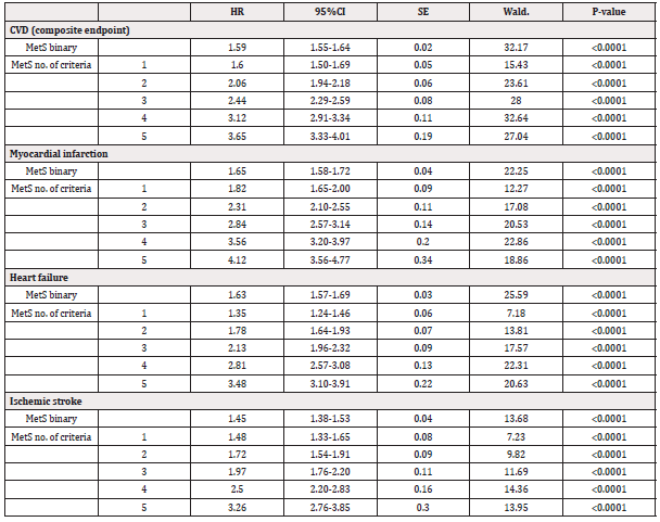20.6% of the sample showed MetS. The incidence of the combined endpoint CVD was roughly twice in individuals with MetS compared to those without (Table 2). Following adjustment for age, sex, and other confounders the HR was 1.59 (95% 1.55-1.64, Table 3).