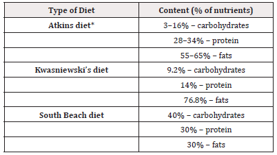 Table 3 presents percentage of nutrient content of different types of diet including Atkins diet [54], Kwasniewski’s, Zone [55], and the South Beach Diet [56].
