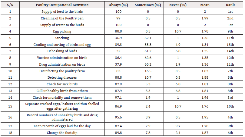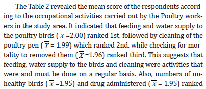 Poultry occupation activities of most poultry farms in Nigeria begin with the acquisition of day-old chicks from a hatchery and undertaking various rearing activities to convert the day-old chicks into full grown poultry bird that produces meat and/or eggs for sale. Throughout these core activities, various decisions are made by farm management officials that may have an impact on well-being of the poultry workers, although, units where individual workers carried out daily management activities are or may be the primary factors of influence of well-being of the Poultry workers in terms of health. National Institute for Occupational Safety and Health [4].