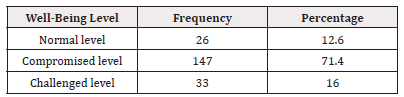 The result in the Table 4 revealed that less more than half (71.4%) of the respondent had a compromised level of well-being which suggests that a sizable majority of respondents are feeling that the poultry occupational activities are limiting or reducing their overall well-being. This could refer to a number of well-being factors, including safety, standard of living, health, relationships and life satisfaction. The weakened state of well-being may be a sign of conditions like health problems, stress at work, or other problems that lower their quality of life. Meanwhile, few (16.0%) of the respondents had a challenged level of well-being which implies that a lower percentage of respondent’s experience challenges or barriers to reaching their ideal level of well-being because of the nature of the poultry occupational activities. In this instance, the word "challenged" can suggest that these people are facing more significant problems or difficulties than the overall sample of responders. Lastly, 12.6% of the respondents had a normal level of well-being which shows that a small percentage of the respondents believes their degree of well-being is satisfactory. It's possible that the respondent’s poultry occupational activities don't have a major detrimental impact on their standard of living, health, safety and general wellbeing.