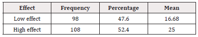 The result of the effect of occupational activities on well-being of poultry workers was derived using the working condition from the activities. The effect was categorized into low effect and high effect using the mean score (= 20.9). The mean and above (= 25) represent high effect of occupational activities on well-being in which 52.4% of the respondent indicated. This suggests that the poultry workers think their employment in the poultry farm will have a significant negative impact on their general well-being. Meanwhile, the mean and below (=16.68) represent low effect of occupational activities on well-being in which 47.6% of the respondents indicated which suggest that some respondents may not believe the activities in the poultry farm have a major influence on their well-being. It's crucial to understand that "low effect" refers to a perceived impact that is lower than that of the group who reported a high effect, not that there is no effect at all (Table 5).