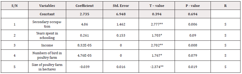 Sex: The result in Table 1 reveals that majority (70.4%) of the respondents were male while few (29.6%) of the respondents were female. This implies that poultry production is male dominated in the study areas probably because of the activities involved in poultry occupation in which most females may not have the strength to cope or withstand the activities. This results likewise agrees with the findings of Ogba, [12] who found that majority of people working in the poultry farm are male in the study area.