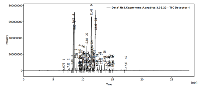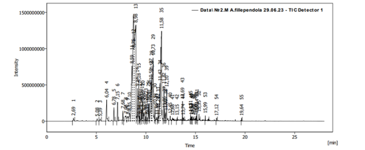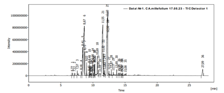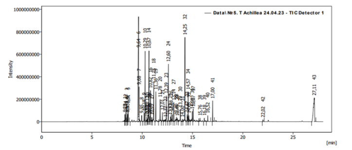 The essential oils of these plants contain a wide range of bioactive components, including terpenes, phenolic compounds, and flavonoids. GC-MS analysis enables a detailed study of the composition of these oils, identifying key components and their concentrations. This is crucial for the development of effective yarrow-based medicines [32-37,14]. To ensure the safety and efficacy of phytopreparations, standardization of their composition is necessary. GC-MS analysis allows for the accurate determination of the qualitative and quantitative composition of essential oils, contributing to the standardization of medicinal and cosmetic products. This is particularly important in the growing natural products market, where quality control is a key factor [38,39]. Achillea L. (Yarrow) is a widely distributed plant that can be easily cultivated in various climatic conditions [9,11,18,22,24,40-45]. This makes it an accessible and economical source of essential oils. GC-MS analysis helps optimize the extraction and refining processes, ensuring high production efficiency at minimal cost. The study of the chemical composition of essential oils from different species of the genus Achillea L. enhances our understanding of the phytochemistry of these plants [4,20,32,33,46]. This is important for basic science as it allows for the identification of new bioactive compounds and the study of their mechanisms of action. Data from GC-MS analysis can serve as a foundation for further biomedical research and clinical trials [12,14,22,29,30,33,36].