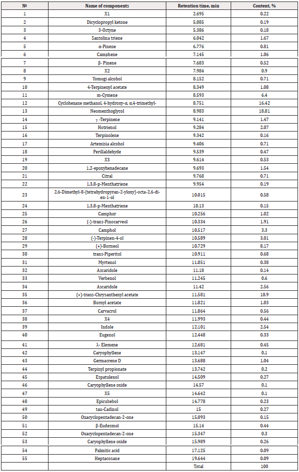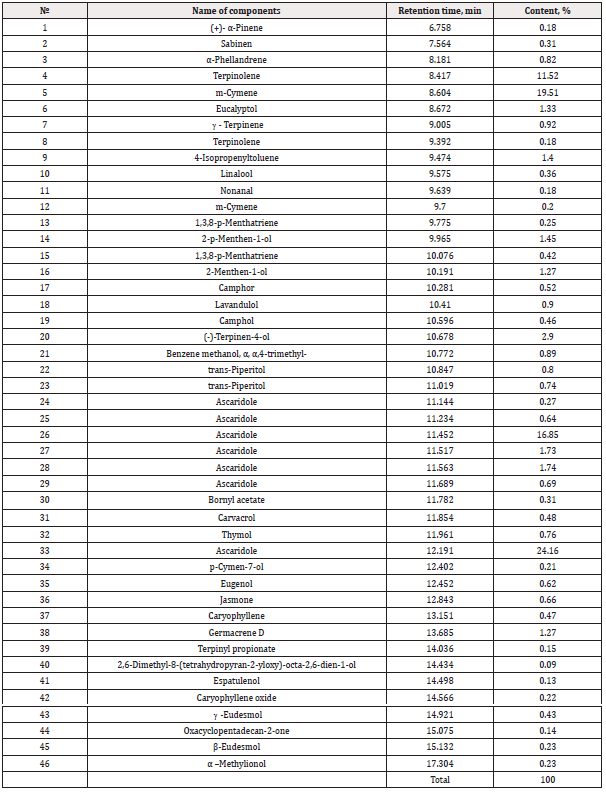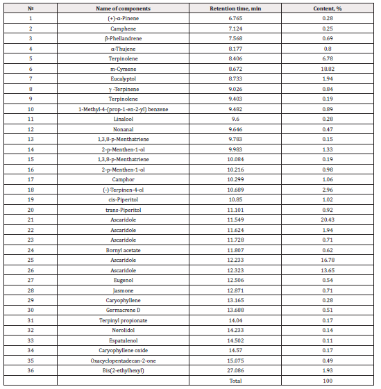 Table 2: Results of GC-MS analysis of chemical composition and content of components of essential oil of Achillea filipendulina Lam.