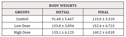 Morphological observation from the study shows an observable significant (P<0.05) increase in the final mean body weight when compared with the initial body weight observable in control vs low dose, control vs high dose and low dose vs control but not observable in low dose vs high dose and high dose vs control dose. The final body weight of the control animals (115.0±3.310) was significantly (P<0.05) higher than its initial body weight (91.40±5.467). however, the mean final body weight of the low dose group (152.4±6.723) and high dose group (160.2±6.018) were significantly (P<0.05) higher than their initial body weights (133.8±3.094) and (135.1±6.125) respectively (Table 1).