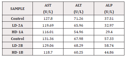 Additionally, Table 2 shows a non-significant decrease in K+ serum concentration when compared with A group high dose (HD–1A=1.54 mmol/L) and a significant rise in K+ serum concentration in the A group when comparing the low dose (LD-2A=1.56 mmol/L) with the control group (control=1.42 mmol/L) (P value < 0.05). The majority of liver disease patients experience abnormal K+ levels; this is consistent with the findings of [3], which show that a similar event occurs during treatment by medication intake or extracellular shift, impairing glomerular filtration due to kidney injury in ESLD and leading to hyperalkalism.