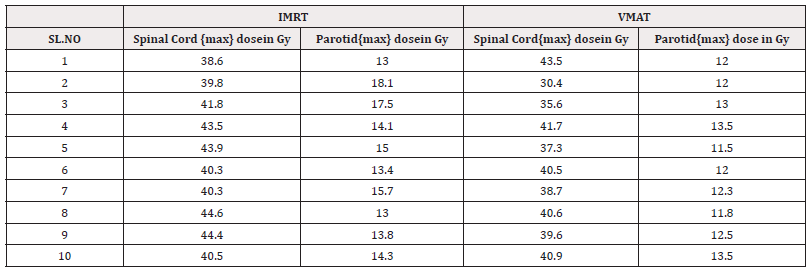 1. 10 patients with oral cavity carcinoma were planned with both IMRT and VMAT technique. There was no significant difference in maximum dose for OARs as spinal cord and parotid of unaffected side. There is good distribution of dose in PTV (Table 1).