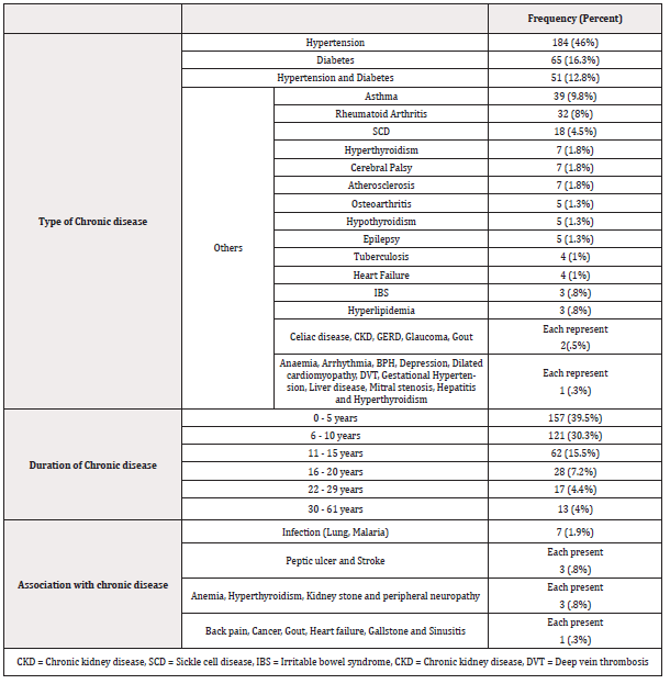 Results: The majority of participant were females 291 (72.8%) and most of participants, 107 (26.7%) were in the age group of 41-50. The study revealed a 55% prevalence of MNA among participants. Key determinants included unavailability of medications (42.8%), high costs (30%), and forgetfulness. The majority of the study population had low educational levels, with 37.5% having only primary education. Financial constraints were significant, with 81% of participants reporting no monthly income. Additionally, 88.3% did not receive community support, and 31.5% had no access to counselling or educational sessions regarding their diseases and medications.