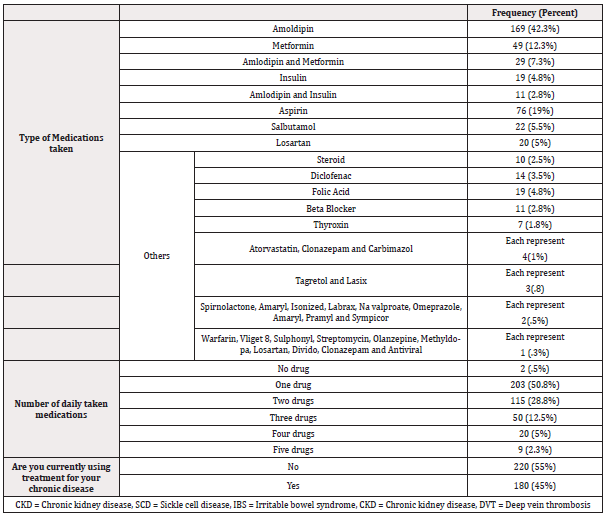 In this cross- sectional community based study, 400 participants were enrolled. The majority were females 291 (72.8%) and 109 (27.3%) were males. 107 (26.7%) of participants were in the age group of 41-50 years of age, 94 (23.5%) were with age group [51-60], 66 (16.5%), [31-40], 43 (10.7%), [ 21-30], 34 (8.5%), [60- 70], 28 (7%), [71-90], 26 (6.5%), [11-20] and 10 (2.5%) in the age group [ 5-10] years old. Regarding marital status 307 (76.8%) were married, 68 (17%) were single and 25 (6.3%) were divorced. In terms of educational level, the majority of participants had only primary education 150 (37.5%), then 114 (28.5%) had no formal education, 88 (22%) had secondary education and 44 (11%) had tertiary education. More than half of women participated in this study were housewife 154 (38.6%), 102 (25.5%) of participants were unemployed. 324 (81%) had no monthly income at all. Half of participants 203 (50.8%) with chronic disease were using at least one drug (Table 1), followed by 115 (28.8%), 50 (12.5%), 20 (5%) and 9 (2.3%) who were using two, there, four and five drugs respectively (Table 2). 304 (76%) faced challenges in accessing their medications after the war due to many factors mostly to unavailability of medication 171 (42.8%) and expensive cost 120 (30%). Furthermore 220 (55%) of participants were not taking their prescribed drugs. Most of patients who can afford their prescribed drugs rarely missed them 248 (62%). Forgetfulness was the most common cause of missing or skipping their medication. 73 (18.3%) of the participants if their doctors prescribed the same medication but from other company they didn’t take them. Out of 400 participants, 353 (88.3%) of them didn’t receive any support from any community resources or programs. Furthermore 126 (31.5%) of participants didn’t received any counselling or educational sessions towards their disease and medications.