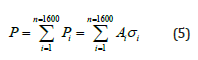 The total applied load on the cross section is equal to the summation of the values that are obtained by multiplying the stress on each fiber by the fiber area (0.0075 in2 from Figure 2). This is illustrated using Equation 5 where Ai is the area of each fiber and Pi is the load within each fiber. load within each fiber.