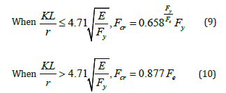 AISC (2012) provides two equations for calculating the critical buckling stress, Fcr, for doubly symmetric prismatic members with non-compact plate elements only. These equations are within Section E3 of the specification. The equation that is used is dependent on the slenderness ratio and whether it is assumed the column buckles elastically or inelastically. Equation 9 is used for inelastic buckling and Equation 10 is used for elastic buckling.