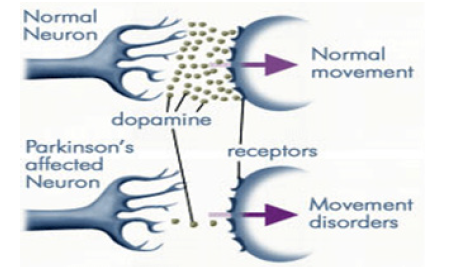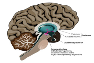 Parkinson’s Disease (PD) is the second most common neurodegenerative disease after Alzheimer’s disease [1]. It is a chronic, progressive disease characterized by both motor and nonmotor features. The disease has a significant clinical impact on patients, families, and caregivers through its progressive degenerative effects on mobility and muscle control. PD is primarily associated with the gradual loss of cells in the substantia nigra of the brain. This area is responsible for the production of dopamine. Dopamine is a chemical messenger that transmits signals between two regions of the brain to coordinate activity (Figure 1). For example, it connects the substantia nigra and the corpus striatum to regulate muscle activity [2]. The motor symptoms of PD are attributed to the loss of striatal dopaminergic neurons (Figure 2), although the presence of nonmotor symptoms supports neuronal loss in nondopaminergic areas as well [3]. PD is the most common form of Parkinsonism [4]. The term parkinsonism is a symptom complex used to describe the motor features of PD, which include resting tremor, bradykinesia and muscular rigidity [3]. People are usually more familiar with the motor symptoms of PD, because these are the signs of the disease that are noticeable from the outside.
