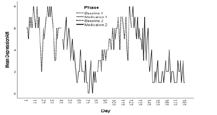 This hypothesis was tested in an open-trial multiple baseline design with alternating on and off medication phases of 12.5mg Sertraline. In phase 1 the medication was compounded into 12.5 capsules, but subsequently, 50mg tables were halved and taken every second day. St Johns Wort 1800mg qd was substituted in the off-medication phases. Phase changes were implemented when stable trends were visible. Daily self-reported records of morning and evening depression levels were kept. Morning levels were generally higher and highly convergent with evening levels (r = .91) thus we show morning levels here. Data are shown in (figure 1). Microdose Sertraline was associated with clinically significant reductions in depression compared to off-medication phases. No side effects were noted. The absence of depression and side effects continued in the 14 months since these data were collected.