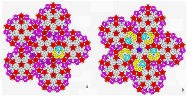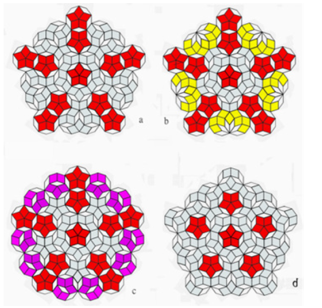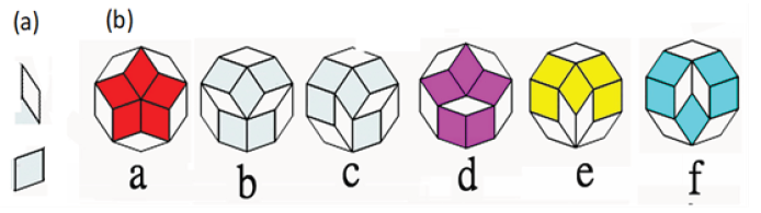 The fat and thin rhombus with different acute angles of 36 and 72 can be regarded as two different atoms, each consisting of four equilateral valence bonds (Figure 1a). Two rhombic atoms can combine to form six different decagonal shapes (Figure 1b), which can be regarded as molecules here. The first three (or possibly the first two) of the six regular decagons make up the famous Penrose tile with five-fold symmetry, as illustrated in (Figure 2). Traditionally, Penrose tiles are laid from two shapes of rhombuses (or kites and darts); this method is tedious and error-prone, and frequently results in incorrect alignment [1]. If the tiles were built specifically from polyatomic molecules made of 50 or more rhombuses, it would save a lot of time and increase the likelihood that the right decisions would be made when laying uninformed tiles [2].