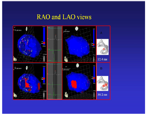 Figure 12: Late activation of the ascending band. At this moment, which corresponds to approximately 60% of QRS duration, the endocavitary activation (descending band) is already complete. The distal portion of the ascending (epicardial) band depolarizes later. This phenomenon correlates with the persistence of the band contraction in the initial phase of diastole. B. Final Activation. In the right panel, the projection was changed from left anterior oblique to left posterolateral, showing very late activation of the distal portion of the ascending band.