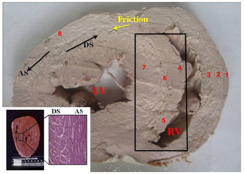 Figure 14: Transverse section of the heart (Human). 1. Interband fibers; 2. Right paraepicardial bundle; 3. Right paraendocardial bundle; 4. Anterior septal band; 5. Posterior septal band; 6. Intraseptal band; 7 Descending segment; 8. Ascending segment; LV: Left Ventricle; RV: Right Ventricle. The black arrows indicate the course of movement in each segment during systole. The yellow arrow indicates the friction plane between the segments; AS: left-handed ascending segment; DS: right-handed descending segment. The box indicates the septum with the different segments that make it up. Lower angle: microscopic view (right) of the interventricular septum medial segment in the human heart, clearly showing absence of transition circumferential fibers between the descending (right) and ascending (left) segments of the myocardium. In the macroscopic (left), it can be seen how the sudden transition of the fiber angle change draws a line that can be perceived.