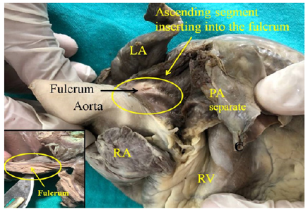 Figure 2: Adult human heart. The ascending segment can be seen inserting into the cardiac fulcrum. LA: Left Atrium; RA: Right Atrium; PA: Pulmonary Artery; RV: Right Ventricle. The right inset shows the fulcrum.