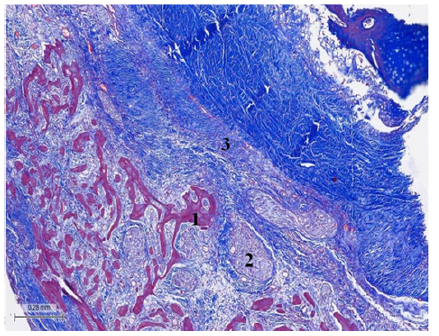 Figure 3: (Bovine heart). Masson’s trichrome technique. 25x. Tangential section of the fulcrum. Fulcrum osseous trabeculae including plexuses with neurofilaments. 1. Osseous tissue. 2. Terminal plexuses. 3. Fibroconnective tissue.