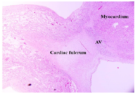 The fulcrum, because of the location in the atrioventricular junction, below the aorta and the pulmonary artery, is adjacent to the AV node, which is situated at its right (Figures 2-5). The important finding originating from both macroscopic and microscopic observations reveal the attachment of myocardial fibers to this nucleus. Its configuration has been histologically confirmed, being its osteo-chondroid-tendinous structure according to the specimens analyzed. In bovids, its size is approximately 37mm long, 45mm wide and 15mm thick, being triangular. In humans, it has the same shape, its size being 50% in each of its dimensions [1,9,17] (Figure 3-5).