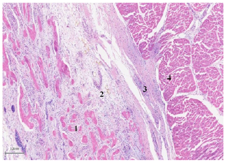 Figure 5: (Bovine heart), H&E (25x). The image shows plexuses associated with fibro-chondroid trabeculae and the myocardium. 1: bone trabeculae. 2: plexuses. 3: fibroconnective tissue. 4: myocardium.