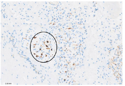 Figure 7: Bovine heart. Immunohistochemistry staining technique for neurofilaments 50x. The encircled area shows axons and ganglion cells. The chondroid tissue in the upper right region corresponds to the fulcrum.