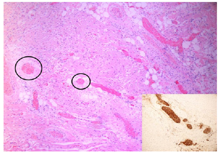 Figure 8: 27-week infant heart. The image shows nervous trunk hypertrophy in the fulcrum (black circles) adjacent to the AV node, HEx200. The inset illustrates the thick nervous trunk in the fulcrum confirmed by immunohistochemistry for S-100.