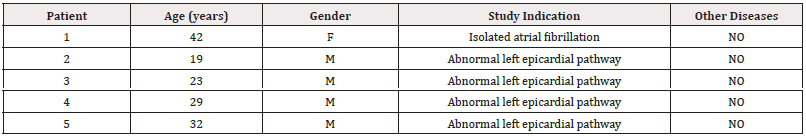 The endo and epicardial electrical activation sequence of the left ventricle has been studied by means of three-dimensional electroanatomic mapping (3D-EAM) with a Carto navigation and mapping system that allows a three-dimensional anatomical representation, with activation maps and electrical propagation. The study included patients who provided their informed consent. The research was previously approved by the Institutional Ethics Committee. All patients were in sinus rhythm, with a normal QRS and did not have evident structural heart disease by Doppler echocardiography and in gamma camera studies (Table 1).