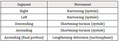 Fiber orientation in the continuous myocardium and their activation implies a sequence of muscle movements, giving rise to four phases: narrowing, shortening-torsion, lengthening-detorsion and expansion, allowing the functions of systole, suction and diastole (Table 4).