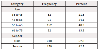 The study characterized patient demographics and assessed the prevalence of various health factors among individuals presenting with acute myocardial infarction at tertiary care hospitals in Karachi. Among the 377 patients analyzed, 40.3% were aged 56- 65 years (152 individuals). Males represented 57.8% (218) of the sample, while females accounted for 42.2%. Hypertension was present in 77.7% of participants, and 52.5% were smokers. Diabetes was observed in 36.3% of participants, and 38.2% reported dyslipidemia. Additionally, 67.4% had a positive family history of MI, and only 9.5% engaged in regular exercise. Whisky consumption was reported by 19.6%, and 60.5% had undergone surgical procedures. Significantly, male participants exhibited a higher prevalence of smoking (83%) compared to females (10.69%) (p-value = 0.000). Alcohol consumption was also notably higher in males (30.7%) compared to females (4.40%) (p-value = 0.000). Surgical procedures were more prevalent among females (77.35%) compared to males (48.16%) (p-value = 0.000). There was a significant association between age groups and the presence of hypertension, diabetes, and dyslipidemia (p-values = 0.000, 0.001, and 0.000, respectively), suggesting variations in prevalence across different age brackets (Table 2) (Chart 1,2).