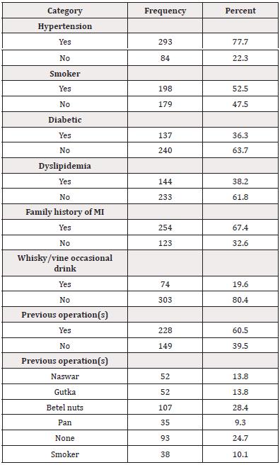 Method: A cross-sectional study was conducted on a sample of 377 patients with acute myocardial infarction. The sample was obtained through non-probability purposive sampling from Dr. Ruth K. M. Pfau Civil Hospital Karachi and the National Institute of Cardiovascular Diseases (NICVD) Karachi. Informed verbal consent was obtained. A pilot study was conducted to assess the validity of the questionnaire. Data was analyzed using SPSS version 22 with a 95% confidence interval, a margin of error of 5%, and a p-value of 0.05 as significant.