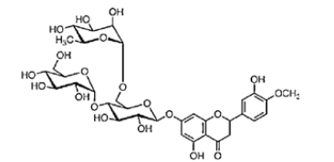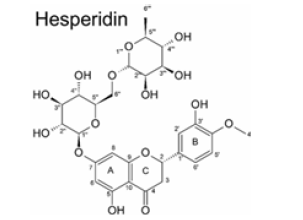 The French pharmacist Lebreton was the first to isolate hesperidin in 1828 from the white inner layer of the peel of oranges, the so-called mesocarp or albedo [1]. It is a major flavonoid compound, present in orange and lemon fruits. Figure 1 shows a citric fruit together with isolated hesperidin. It is also common in other citrus fruits. In the peels of oranges and lemons hesperidin is the main flavonoid and is found there alongside hesperetin. Sweet oranges (Citrus sinensis) and tangelos are considered the most important source of this bioflavonoid. In some orange varieties hesperidin makes up up to 4.1% of the dry matter of the peel. 470–761 mg/L of Hesperidin is normally present in orange juice [2]. It can vary widely between different fruits [3]. If the juice contains crushed fruit it has more of this flavonoid than without pulp. It can be extracted from orange peels, taking care to extract a larger amount of the white inner layer. Naringin, hesperidin, neohesperidin, narirutin, and eriocitrin are the major flavanone-7-O-glycoside constituents in citrus fruit juices and can be separated as diastereomers by multidimensional liquid chromatography [4]. Hesperidin was present in orange juices almost exclusively as the 2S isomer. Hesperidin can also be found in green vegetables and in the uppercase sections of the Rubiceae genus as well as in the roots and entire grasslands of cruciferous plants [5] (Figure 1).