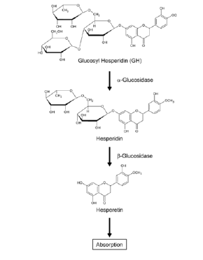 The use of hesperidin as a drug or supplement is limited because it has low solubility in water and poor bioavailability after oral administration. There are several points that influence the extent to which the substance can be used by the body. As discussed above hesperidin is modified by enzymes of the microbiota. Therefore, its amount, concentration and composition influence the catalytic reactions and the performance of gut microbial enzymes. In the small intestine hesperidin is metabolized to hesperitin by removing the sugar moieties by two gastrointestinal micro-flora’s enzymes, alpha rhamnosidase and beta glucosidase [11]. Especially the performance of alpha rhamnosidase influences the amount of hesperidin that is deglycosylated to hesperitin. If, depending on the microbioty it is inactive, the large intestine stops producing hesperitin [27]. Consequently, as the gut microbes differ between individuals, there is a major variety because of that for the bioavailability of hesperidin. It might be that additionally to the activity of alpha-rhamnosidase other reactions also the bioavailability of hesperidin and results in biologic consequences [1]. Hesperidin can be taken as pure substance, as alpha-glycosylated form or within food where it naturally occurs like orange juice, lemon and citric fruits or the purified product added to food like yoghurt [28]. This might also affect how bioavailable it is in this situation. The phrase “bio accessibility” is used to indicate the portion of a substance which is liberated from its prevailing conditions into the intestinal system and then made accessible for the body. Upon a clinical trial it was concluded that the low level of fats in the yoghurt might contribute to its lack of impact on bioavailability of orange juice flavanones [28].