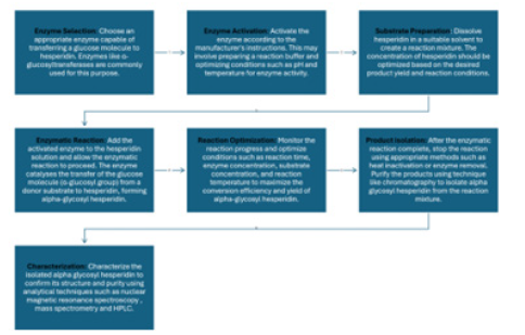 Dried orange peel is the raw material for the extraction of hesperidin from natural sources. Several different methods exist [14]. Often, petroleum ether is used to remove the essential oils and then to extract the glycoside hesperidin by methanol. Another method uses alkaline extraction of chopped orange peel and then an acidification of the extract. From this acidic extract hesperidin can be crystallized. Further extraction procedures include including maceration, extraction with ultrasound, high hydrostatic pressure and microwave assisted extraction, enzymatic processes and extraction supercritical fluids [15]. Because these methods are all not very economically friendly and use organic solvents a new green method with low energy consumption was invented by Stanisic, et al. [15] Alpha-glycosyl hesperidin is obtained from the purified natural substance hesperidin. The essential step to convert normal hesperidin to alpha-glycosyl hesperidin involves enzymatic processes that transfer a glucose molecule (α-glucosyl group) to hesperidin [7]. This modification enhances the solubility and bioavailability of hesperidin, making it more suitable for various applications. Figure 4 shows the sequential process to obtain alpha-glycosyl hesperidin and this general overview of the steps involved in the conversion will be described in the following. In a first step an appropriate enzyme that is capable of transferring a glucose molecule to hesperidin must be chosen. Enzymes like α-glucosyltransferases are commonly used for this catalysis. Next the appropriate enzyme conditions must be applied. Enzymes can be obtained commercially, and the process be done according to the manufacturer's instructions. This may involve preparing a reaction buffer and optimizing conditions such as pH and temperature for enzyme activity.