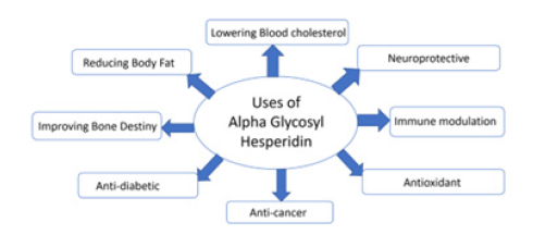 Figure 5: Uses of alpha glycosyl hesperidin. The benefits of hesperidin for human health are possible applications of alpha gycosyl hesperidin.