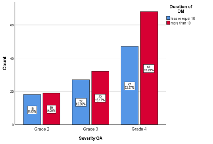 This study showed that there was an association between DM duration and the severity of osteoarthritis. Similar to, a previous study conducted in Bruneck indicated that the relationship between OA and type 2 diabetes shows that variations in glucose metabolism directly impair joint integrity regardless of body weight, creating optimism that effective regulation of glucose metabolism slows the development of OA [9]. Furthermore, type 2 diabetes is one of the risk factors associated with severe OA [9].