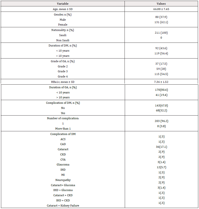 The demographic and clinical features of the patients are shown in Table 1. 211 individuals were included in the study. (mean [SD] age 66.88 [7.45] years; 131 [62.1%] females; mean [SD] Hemoglobin A1c (HbA1c) averaged was 7.36 [1.52]). All patients were Saudi. In the duration, the duration of DM was 56.4 % of those who have a disease for more than 10 years, compared with 80.6% in the duration of OA for 10 years or less. Grade of OA was high in grade 4 with 54.5%. 143 out of 211 do not have any complication regarding DM, the rest have one complication with 96.2%. The most common complication of DM is Cataract with 17.1%. Figures (1 to 9) show the demographic characteristics of patients. The frequency of Severity OA in the patients with DM and duration for ≤10 years was 43.6%. There was no statistically significant difference between the two groups in terms of demographic characteristics (0.656). See Figure 10. The correlation of HBa1c and severity of osteoarthritis components with DM diagnosis was calculated. There was a good positive correlation between HbA1c and the severity of osteoarthritis (r = 0.015) (Tables 2,3).