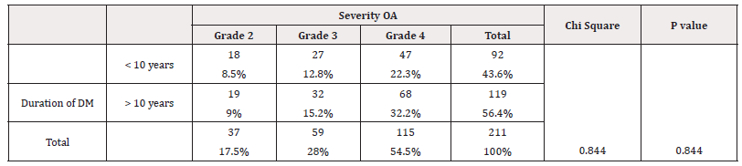 Results: There was a good positive correlation between HbA1c and the severity of osteoarthritis (r = 0.015). The severity of knee osteoarthritis was higher among the patients who had diabetes for >10 years.