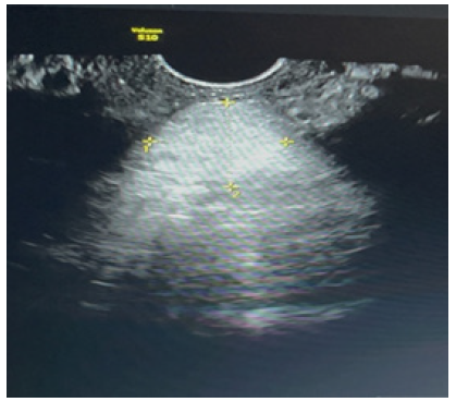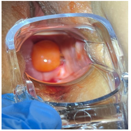 A.S, a 45-year-old woman, has a history of two vaginal deliveries and a Transobturator Tape (TOT) procedure performed 10 years ago for urinary incontinence; she has no other illnesses, allergies, or history of medication use; her body mass index is 27, and she smokes 1.5 packs of cigarettes per day. The patient underwent TLH (Total Laparoscopic Hysterectomy) and Bilateral Salpingectomy due to abnormal uterine bleeding, with preoperative pathology tests revealing benign results. During the operation, the vaginal cuff was circumferentially cut from front to back using a monopolar hook, and the vaginal cuff was sutured with 2.0 V-loc. Postoperative follow-ups were uneventful. 1.5 months after the operation, she presented to the gynecology clinic with complaints of bloody vaginal discharge, a sensation of pressure towards the vagina, and lower abdominal pain following coitus. On speculum examination, a 3x3 cm prolapsed mass from the vaginal cuff and minimal vaginal bleeding was observed (Figure 1). Vital signs were stable, together with an unremarkable abdominal examination. Her bowel sounds were also found to be normoactive on auscultation. Vaginal ultrasonography showed a solid mass above the cuff, with no evidence of bowel prolapse (Figure 2). Laboratory tests, including hemogram and biochemical studies, were normal. The patient was thus admitted to emergency surgery for transvaginal cuff repair due to suspicion of vaginal cuff dehiscence and omental prolapse. Peroperatively, the omentum was reduced back into the abdomen via vajinal route in trandelenberg position (Figure 3). Upon further examination the vaginal cuff was found to be partially necrotic. Single interrupted sutures with 0 Vicryl were placed in a 4cm long dehisced cuff (Figure 4). No issues were detected during the 1st week and 2nd-month postoperative follow-up.