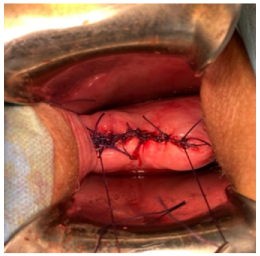 Hysterectomy is the most frequently performed procedure among gynecological surgeries [2]. In our clinic, 1,838 hysterectomies were performed over a 10-year period from 2014 to 2024, during which 3 cases of vaginal cuff dehiscence (VCD) requiring surgical correction were observed. The definition of VCD can range from partial opening of the vaginal cuff to the prolapse of abdominal contents into the vagina [3]. The most severe scenario is the prolapse of the small intestine into the vagina, which is a condition requiring urgent surgery due to the risk of acute small bowel ischemia, peritonitis, and sepsis. The definition and incidence of VCD vary from study to study. In literature, the incidence of vaginal cuff dehiscence is reported to range between 0.14% and 4.1% [4,5]. This rate is 0.16% in our clinic.