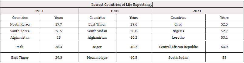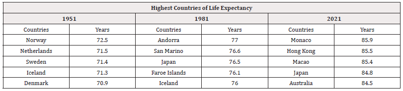 As a result, life expectancy is low. Tables 1 and 2 show the highest and lowest values in the world countries in 1951, 1981, and 2021. Monaco, 85.9 years old in 2021, has the highest life expectancy value, and Chad, 52.5 years old, has the lowest. From 1951 to 2021, the highest value increase was +13,4 years. In addition, the lowest value increase is +34,8 years. This means that people's lives have increased and improved (Table 1).
