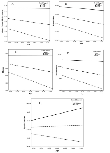 The findings for sustained attention exhibited similar patterns in relation to the impact of age and social support levels.