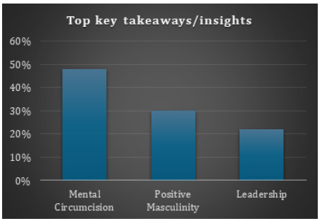 The three top takeaways were: mental circumcision, positive masculinity and the role of male leadership. The term ‘mental circumcision’ (48%) was introduced by the Chairperson of the Men’s Forum: Correctional Services (Eastern Cape). The speaker reflected on his 20-year experience of working at a prison, and his encounters with young men. His vast experience has convinced him that young men are fighting many battles of the mind; these battles are influenced by friends, family, male socialisation and culture. The speaker emphasised that change can only happen when male students decide that they want to be better males, despite the road toward transformation not being easy. He urged them to think about this, as he does not want them to end up in a prison men’s forum with regrets, and he called for a circumcision of the mind that will result in changed behaviour and perspectives.