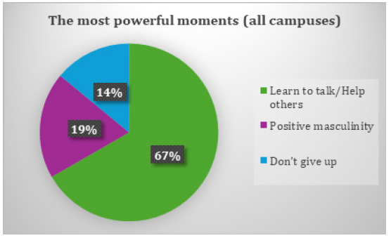 The statements and graphic presentation above show that there is a willingness by male students to be change agents in their immediate environments. The statistics further highlight that the objective of the session was met, with 62% of the students understanding the concept of telling their story when experiencing any aspect of hardship. The event was able to destigmatise men speaking out. In addition to the above, the historic three-day Inter-Institutional Men’s Well-Being Conference, a collaboration between the University of the Free State (UFS) and Walter Sisulu University (WSU) (held on the Potsdam Campus of WSU), made a strong positive contribution to the mental health challenges faced by of young males’ students. The conference was attended by 82 male students from WSU (75%) and UFS (25%). The student delegations reflected on their key takeaways from the conference, as presented below (Figure 2).
