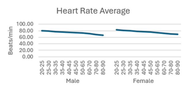 HRV encompasses data such as heart rate average (at rest), SDNN and RMSSD, all of which may manifest fluctuations with age, exhibiting regular changes. A substantial body of research exists on the relationship between age and HRV. For example, Voss and colleagues investigated the association between short-term heart rate variability and age in a cohort of healthy individuals. To this end, they calculated 5-minute linear and nonlinear HRV characteristics for 1906 healthy samples from the KORA S4 database. Furthermore, they investigated the development of HRV characteristics by age (25-34, 35-44, 45-54, 55-64, and 65-74 years). The results of this study demonstrated that the majority of short-term HRV characteristics exhibited significant intergroup variability [12]. In 2018, Estevez-Baez et al. evaluated the impact of age, gender, and heart rate on HRV characteristics in 255 healthy adolescents, categorized into two groups (13-16 and 17-20 years old) and two groups of healthy young adults (21-24 and 25-30 years old). This was achieved through experimental calculation of time, frequency, and information domains of HRV, with changes in HRV characteristics modelled using multiple linear regression models to adjust for the effects of heart rate, age, and gender. The findings indicated a tendency for HRV eigenvalues to decrease with age [13]. In general, there was a negative correlation between age and HRV eigenvalues. Additionally, Abhishekh et al. analyzed data from 189 subjects and found that SDNN, RMSSD, and total power were negatively correlated with age, indicating a decline in autonomic regulation of the heart as age increases [18]. Conversely, the LF/HF ratio showed a positive correlation with age, suggesting a relative increase in sympathetic activity. The study concluded that overall autonomic control of the heart decreases with aging, and females exhibited greater vagal tone compared to males.