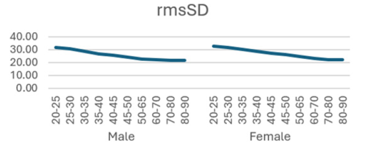 RMSSD is obtained by first calculating the time difference (in milliseconds) between each successive heartbeat, then squaring each value and averaging the results, and then taking the square root of the total. This process captures the beat-to-beat variability of the heart rate and is able to reflect the activity of the vagus nerve [15,16]. Most studies have shown a negative correlation between rMSSD and age [17], although Glaucylara, et al. showed a U-shaped change in rMSSD with age [18]. A study concluded that higher RMSSD in COVID-19 patients is linked to lower inflammation levels, a reduced need for treatment, and a shorter hospital stay [23]. Another study found that patients with diabetes and arterial stiffness had lower RMSSD, which is associated with a worse cardiovascular risk profile. These findings suggest that RMSSD is correlated with positive clinical outcomes [26]. Our results demonstrated a declining trend in rMSSD with age, with a more pronounced decline observed in females. This suggests a reduction in vagal mobility of HRV with age, indicating a loss of cardiovascular system variability during the natural aging process.