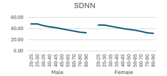 The standard deviation of the normalized NN intervals (SDNN) is expressed in milliseconds [15]. SDNN values can be used to predict the morbidity and mortality associated with heart disease. They are negatively correlated with heart risk, whereby values above 100 ms indicate a healthy state, while values below 50 ms are indicative of an unhealthy state [19,20,26] study showed that SDNN decreased linearly with age in 553 healthy participants, with males exhibiting significantly higher values than females [22]. In a study conducted by Beckers et al., 24-hour electrocardiogram (ECG) signals were recorded from 276 healthy subjects aged 18 to 71 years. The findings indicated a decline in SDNN values with advancing age [27]. The results align with our study, demonstrated that SDNN values were slightly lower in women than in men and exhibited a progressive decline with age, indicating an incremental increase in the risk of cardiovascular disease in the elderly.