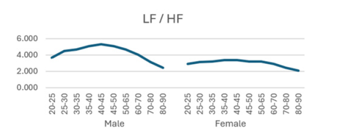 Low frequency (LF) corresponds to variability in the frequency range of 0.04 Hz to 0.15 Hz and is primarily regulated by the sympathetic nervous system. The LF component of the spectrum is indicative of the sympathetic regulation of heart rate variability and is associated with stress and mood in vivo. It primarily reflects stress receptor activity at rest [26]. In contrast, high frequency (HF) corresponds to variability in the frequency range of 0.15 to 0.40 Hz and is reflective of parasympathetic activity [25]. A reduction in HF typically indicates a deterioration in cardiovascular health, which may be indicative of an increased risk of cardiovascular disease [24]. The LF/HF ratio is a measure of the relative activity levels of the sympathetic and parasympathetic nervous systems. Higher values indicate increased sympathetic activity, whereas lower values imply a predominance of parasympathetic activity. This is a sensitive predictor of arrhythmia, and changes in values often imply an unstable electrical activity of the heart. Our results demonstrated a decline in both LF and HF with age, accompanied by an initial increase and subsequent decline in LF/HF, exhibiting an "n" pattern. It seems reasonable to posit that middle-aged individuals are more susceptible to autonomic nervous system dysfunction as a consequence of the elevated LF/HF ratio, which may be attributed to the persistent sympathetic hyperactivity induced by their fast-paced occupational circumstances [27-32].