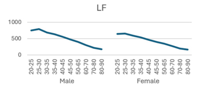 Additionally, (Figures 1-8) depict the graphical distribution of each HRV metric across the different age groups. Specifically, LF/HF demonstrated a pattern of initial increase followed by decline with age. Other indicators, including HRV, rmsSD, SDNN, total power, LF, HF, and autonomic tones, all exhibited a negative correlation with age, indicating a general decline in heart rate variability as individuals age. Additionally, the indicators demonstrated variability across gender groups, with males and females showing different patterns in HRV metrics.
