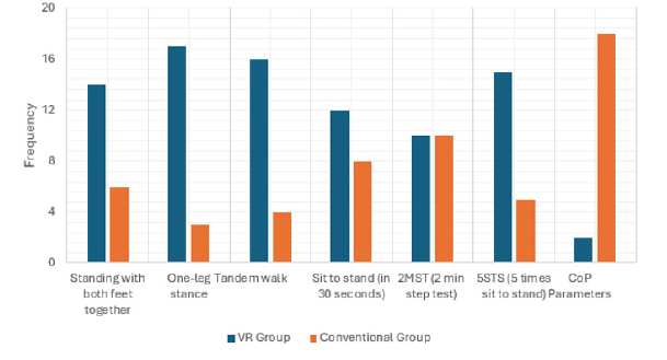 The results Figure 1 analyzed by a blinded observer revealed that the VR group had a lower Center of Pressure (CoP) characteristics as compared to the traditional training group, implying that the VR-based training was better in terms of postural control than the conventional training. This supports the need for further research to see if the VR is a tool of neuro-therapy, neuro-rehabilitation, and fall prevention among geriatric patients and if it is superior to the traditional balance training methods (Figure 1).